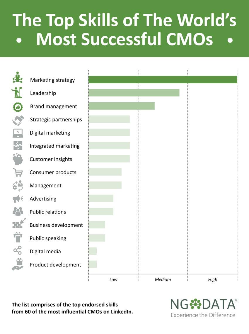 Finally, we’ve created an infographic to illustrate the most common skills shared among the world’s most successful CMOs. To get this info, we reviewed the profiles of the 60 most influential CMOs. Feel free to share it, but please credit NGDATA as the source.